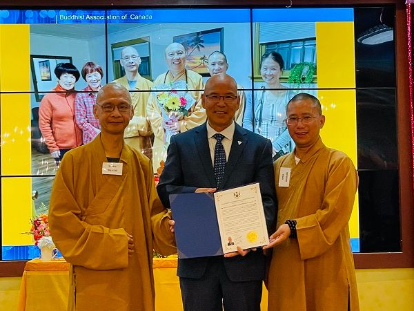 9月20日晚上,开幕仪式在《三宝歌》声中开启。开幕仪式上,加拿大普济禅寺住持圣光法师、多伦多省议员、加拿大国际佛教联合会会长照续法师分别致辞。