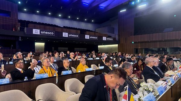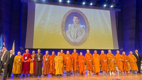今天全球国际代表和佛教领袖发表演讲,我们坚信本届大会汇集所有参与者和全球合作,能够指引人们的行为走向世界和平。