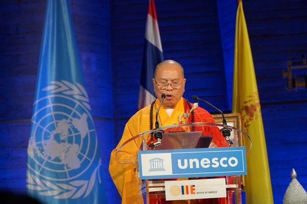 泰国驻法国特命全权大使、泰国驻联合国教科文组织常驻代表萨伦·查伦苏万阁下致欢迎词表示:希望可以通过教育建设可持续发展的和平社会,将佛教的教育应用在现代生活中,尊重自然资源。泰国向全世界展示了佛教是可以构建和谐社会,推动和平社会的可持续发展。我们要在这个挑战的世界展现我们的对策。这是一个重要会议。我们要团结一致用佛教思想来推动和平世界。