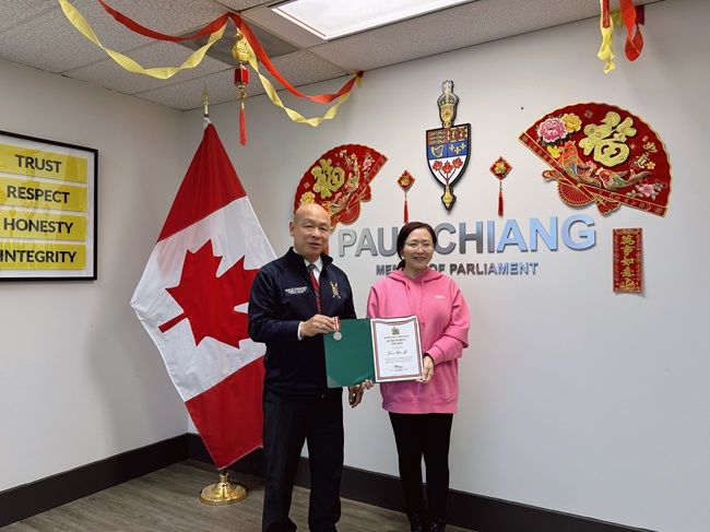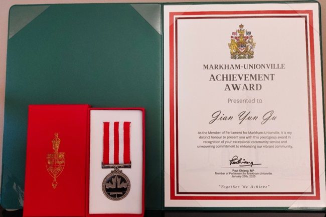 【红枫林讯/尹轩】 2025年1月25日,加拿大移民、难民与公民事务部长驻国会秘书、国会议员蒋振宇(Paul Chiang),在其位于万锦市的办公室为红枫林传媒集团董事长谷剑云、红枫林驻多伦多记者杨浩蓬、路通社副社长谢祥广颁发了“MU卓越成就奖”(Achievement Award)的勋章与证书。
