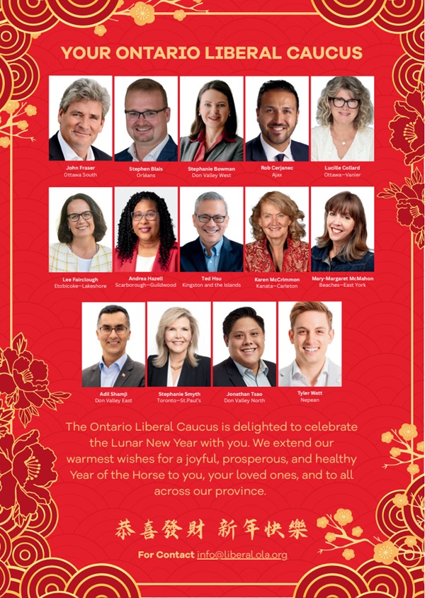 出席庆新春活动的省议员还有:Ajax区省议员Rob Cerjanec、Don Valley West区省议员Stephanie Bowman、Etobicoke—Lakeshore区省议员Lee Fairclough、Scarborough—Guildwood区省议员Andrea Hazell、以及Toronto—St.Paul's区省议员Stephanie Smyth。