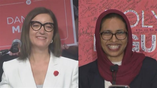 2026年4月13日,自由党候选人Danielle Martin(左)和Doly Begum在赢得多伦多两个选区后向支持者发表讲话,这使得联邦自由党获得了多数席位,组建了联邦政府。CITYNEWS
