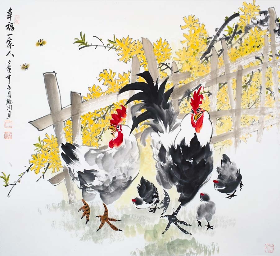 一幅幅生动的画作,一笔笔浓墨淡彩,一划划粗细有致的线条,以及整幅作品所展现出的意境和心境,性格和心态,品质与思维,跃然纸上。除了思想上的震撼,更有记忆深处的共鸣。这些作品几乎囊括了农村几乎能见到的所有家养鸡!无比传神!这不就是记忆中故乡的村巷里到处奔走觅食的散养鸡嘛!即使村里不识字的村妇,看到之后也必然会引发共鸣:这就是农村生活中最寻常的物什!这不仅仅是生活,更是乡愁,是万民的生计,是大批乡村的生态、精神以及割舍不断的乡愁!