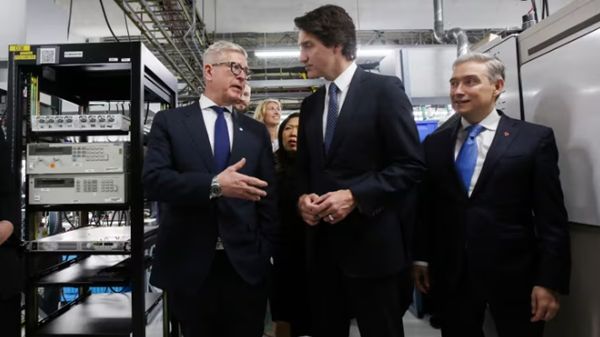 资料图片:2023年4月17日,爱立信首席执行官Borje Ekholm(左)、总理贾斯汀·特鲁多和创新、科学和工业部长商鹏飞参观了位于渥太华卡纳塔社区的爱立信研究实验室。(Lars Hagberg/Reuters)