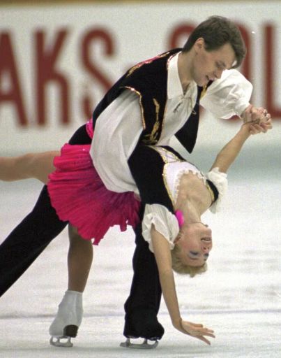 1995年12月9日,在日本名古屋举行的国际花样滑冰比赛中,俄罗斯的Evgenia Shishkova 和 Vadim Naumov在自由滑比赛中表演。(AP Photo/Shizuo Kambayashi,File)