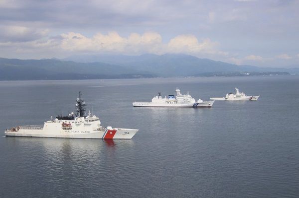美国海岸警卫队(左)、日本海岸警卫队(中)和菲律宾海岸警卫队的巡逻船于2025年6月20日在日本南部鹿儿岛县附近参加联合训练。(Japan Coast Guard via AP)