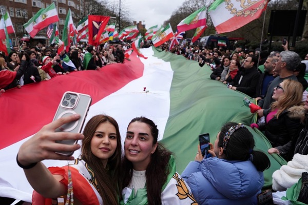 2026年3月1日,人们在伦敦市中心的伊朗大使馆外举行示威活动,声援美国和以色列对伊朗的空袭。(Jonathan Brady/PA via AP)