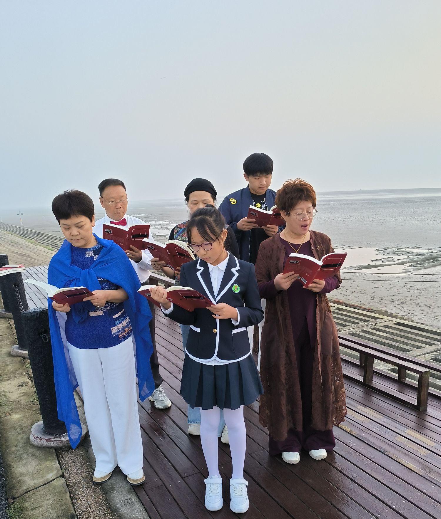 陆思睿手里摇动着国旗,太阳冉冉升起,海边朗读会在《大海呀故乡》合唱声中结束。